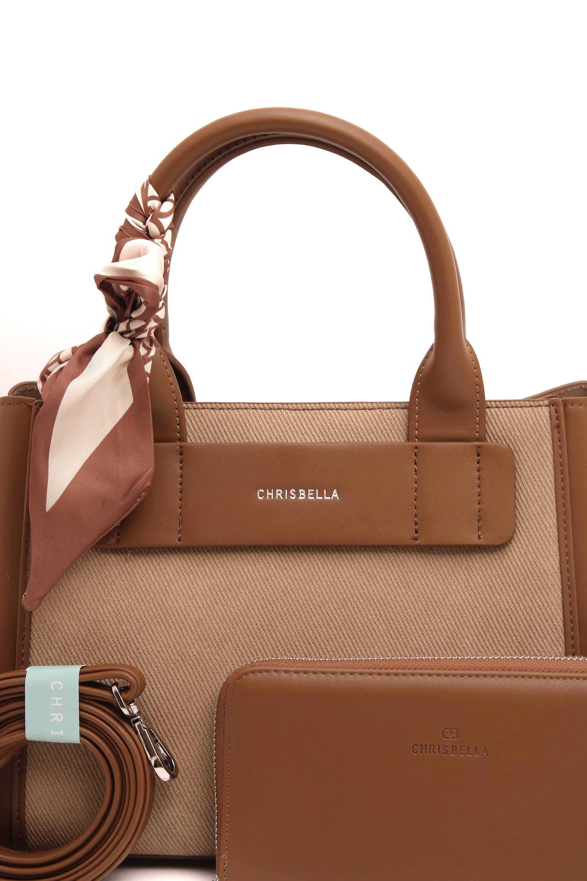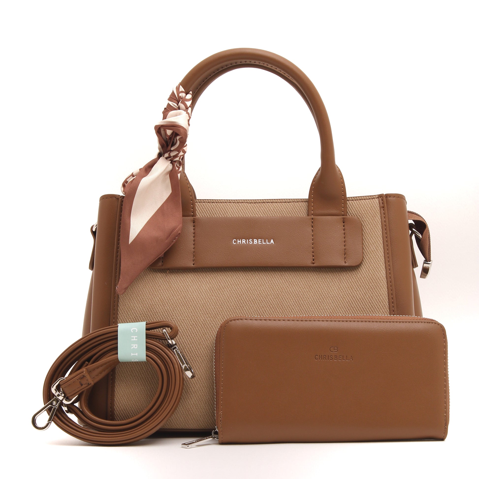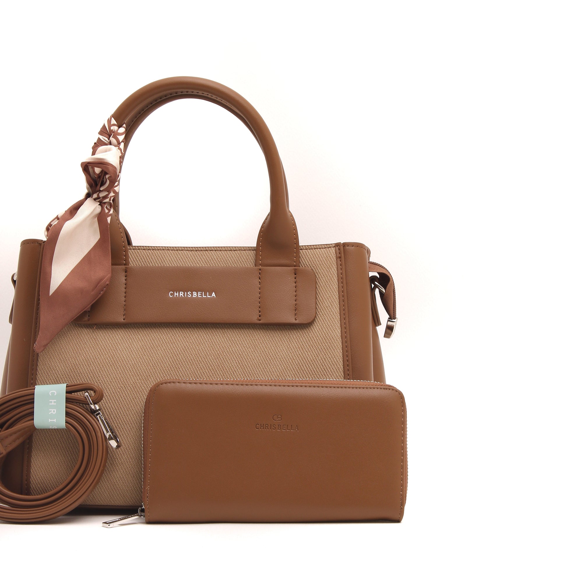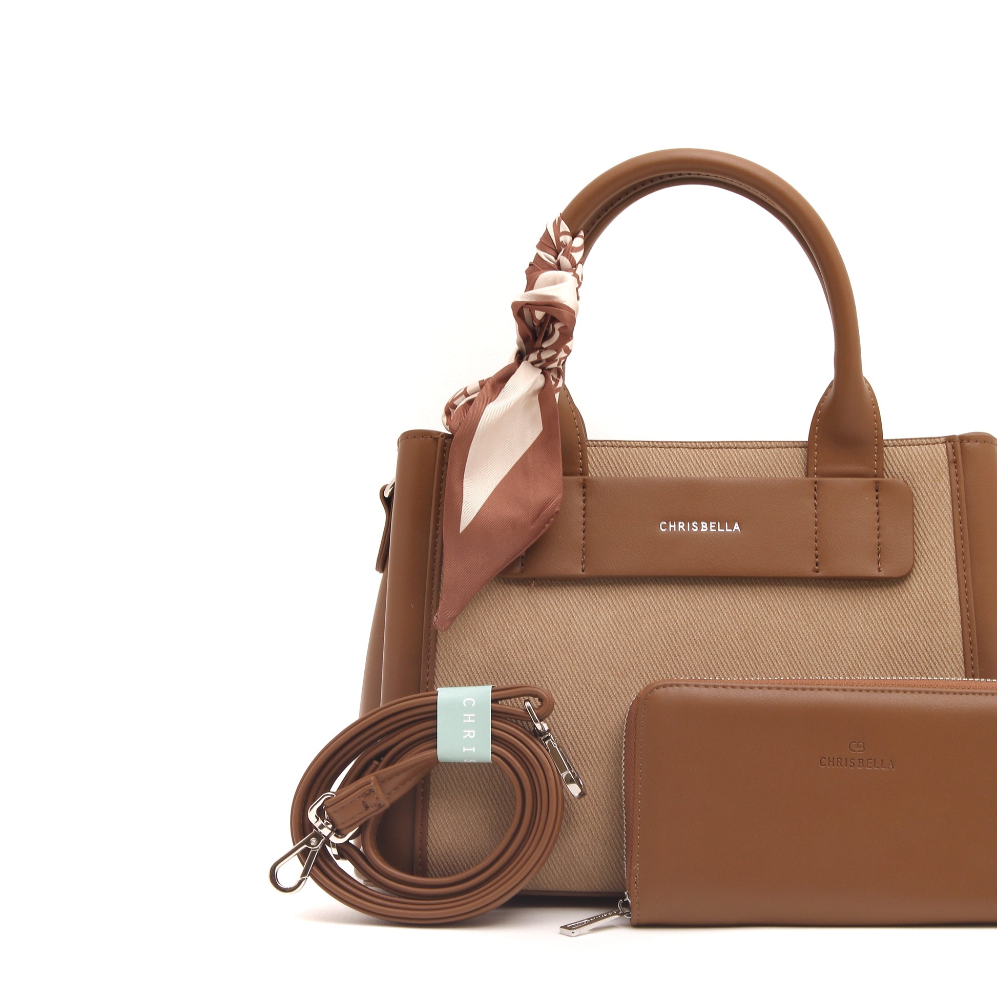 Thoughtful details such as the signature Chrisbella logo, elegant top handles, and a feminine scarf accent add a polished finish. Complete with a matching wallet and a detachable shoulder strap, this bag adapts effortlessly from day to evening.
