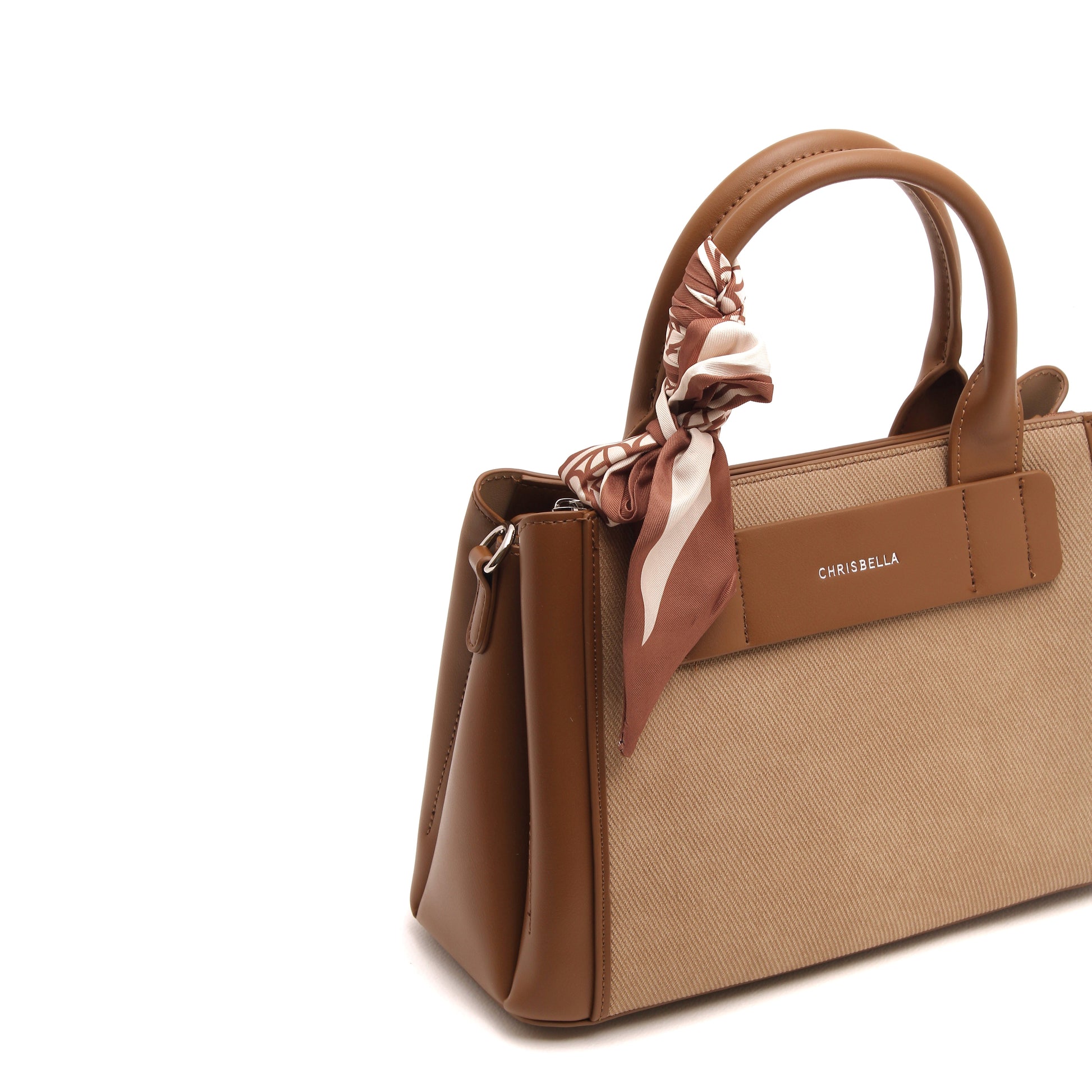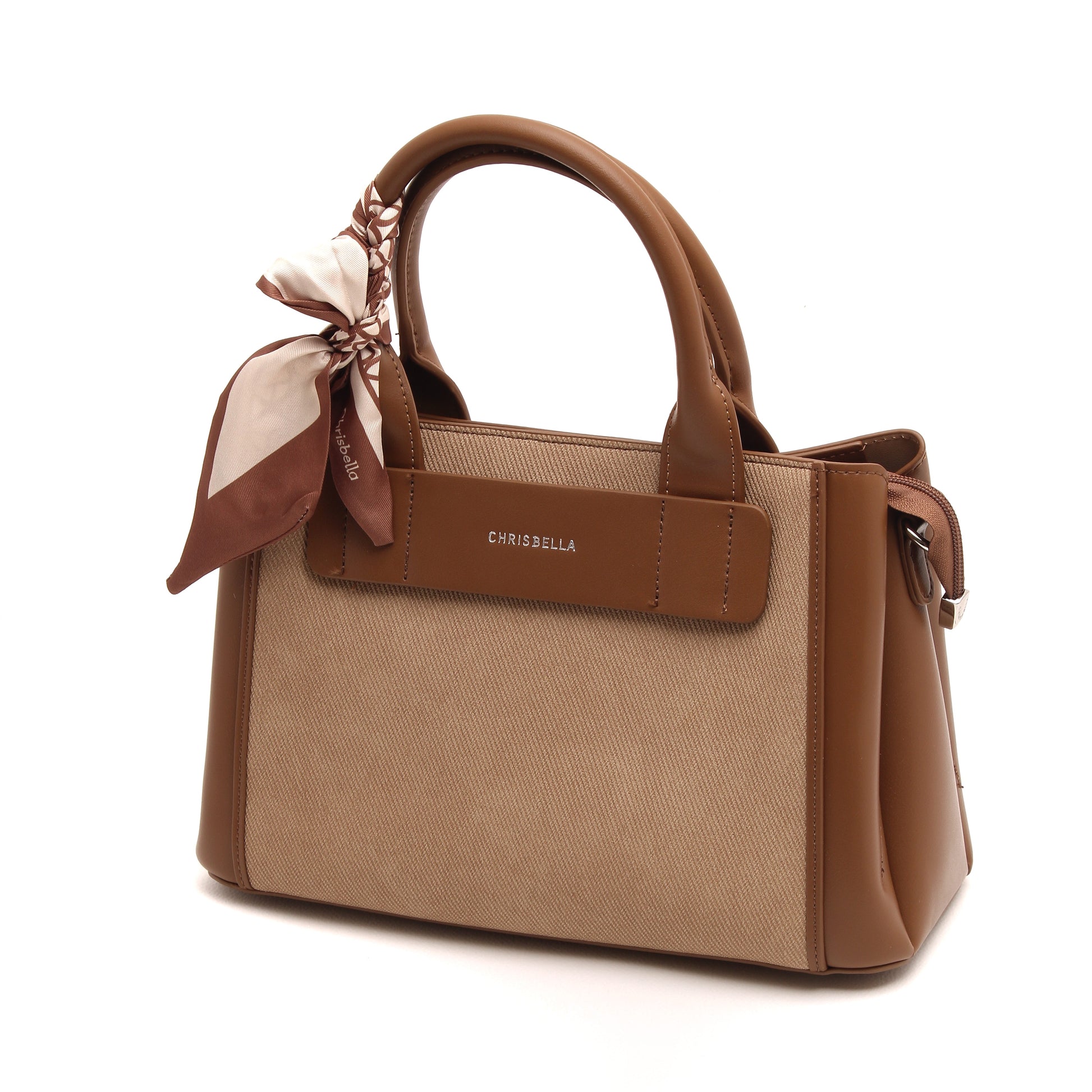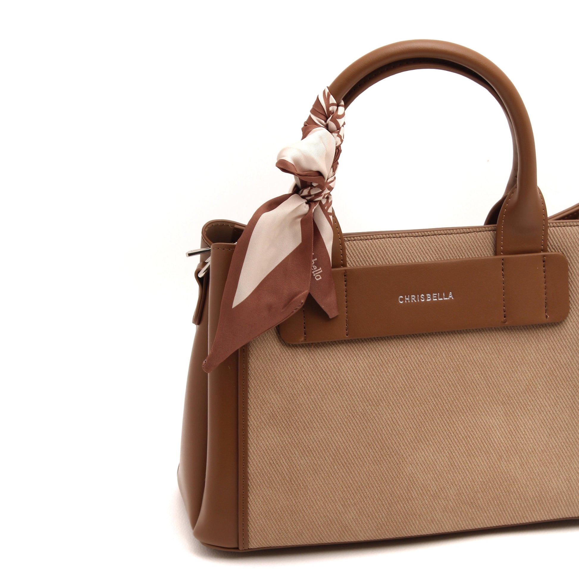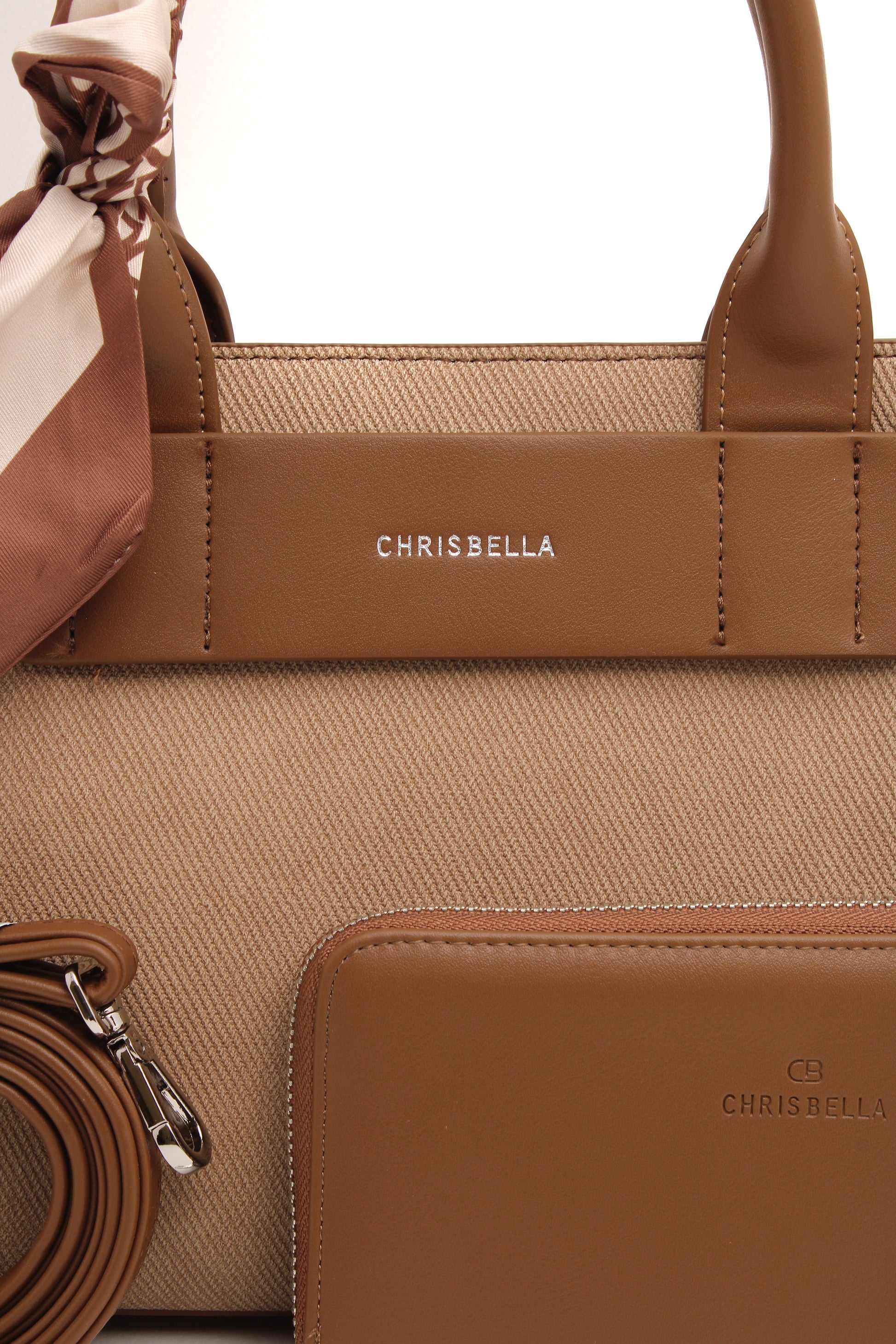 Thoughtful details such as the signature Chrisbella logo, elegant top handles, and a feminine scarf accent add a polished finish. Complete with a matching wallet and a detachable shoulder strap, this bag adapts effortlessly from day to evening.