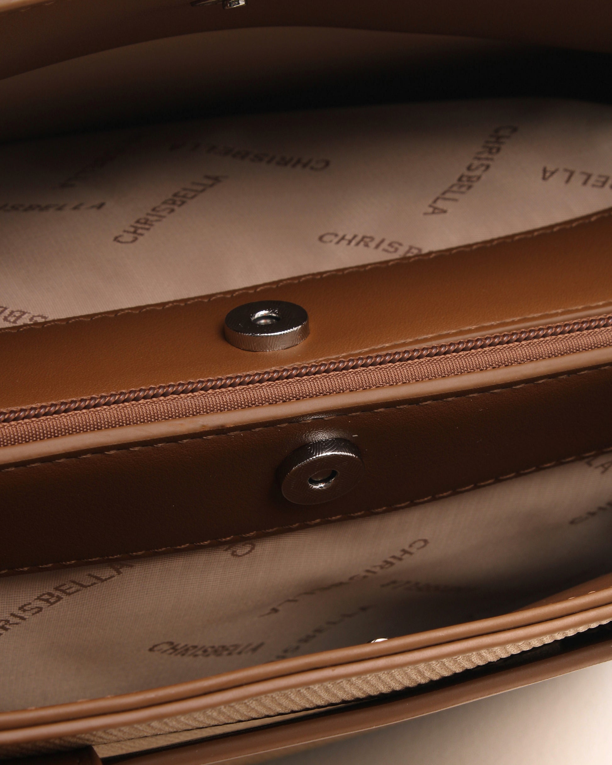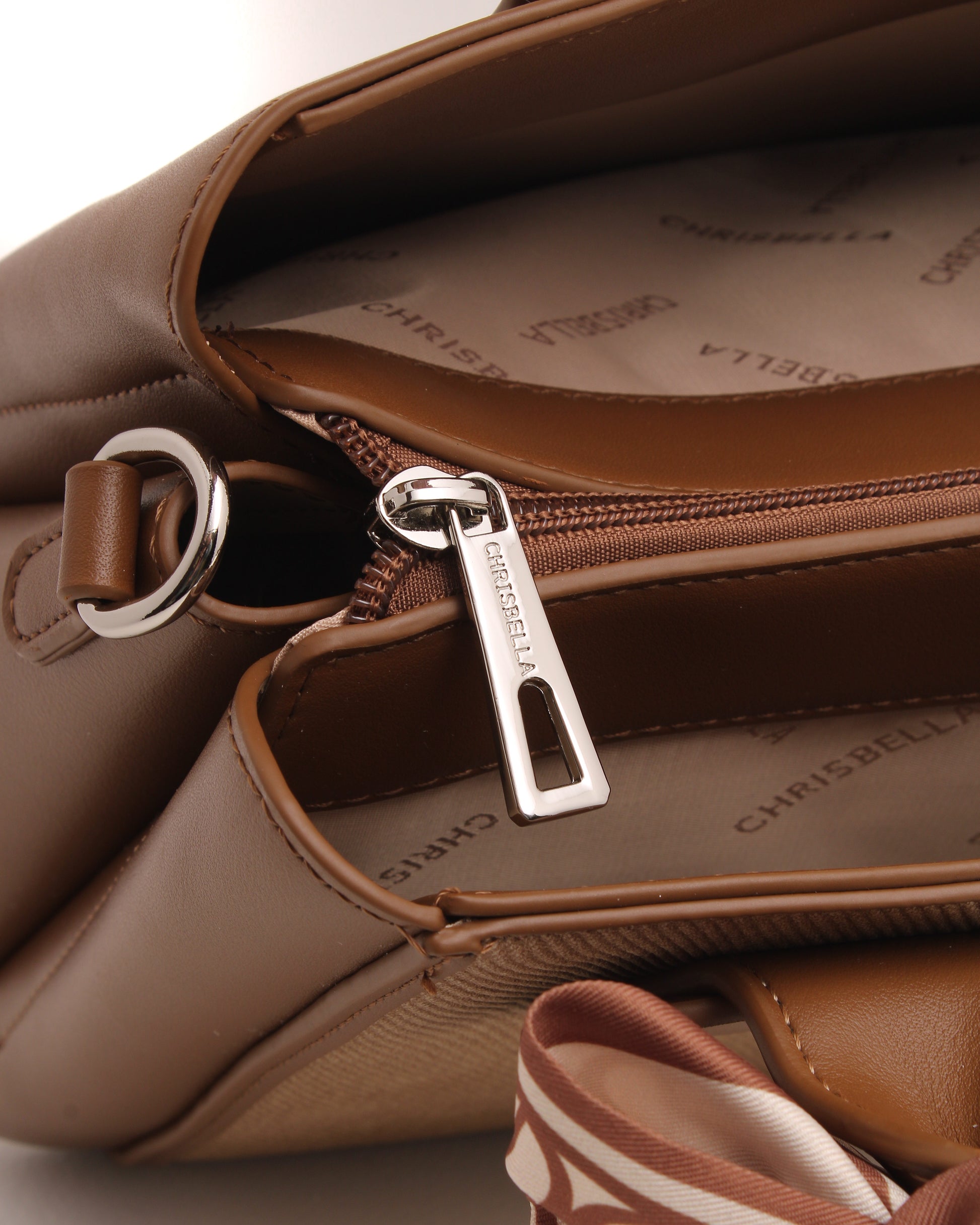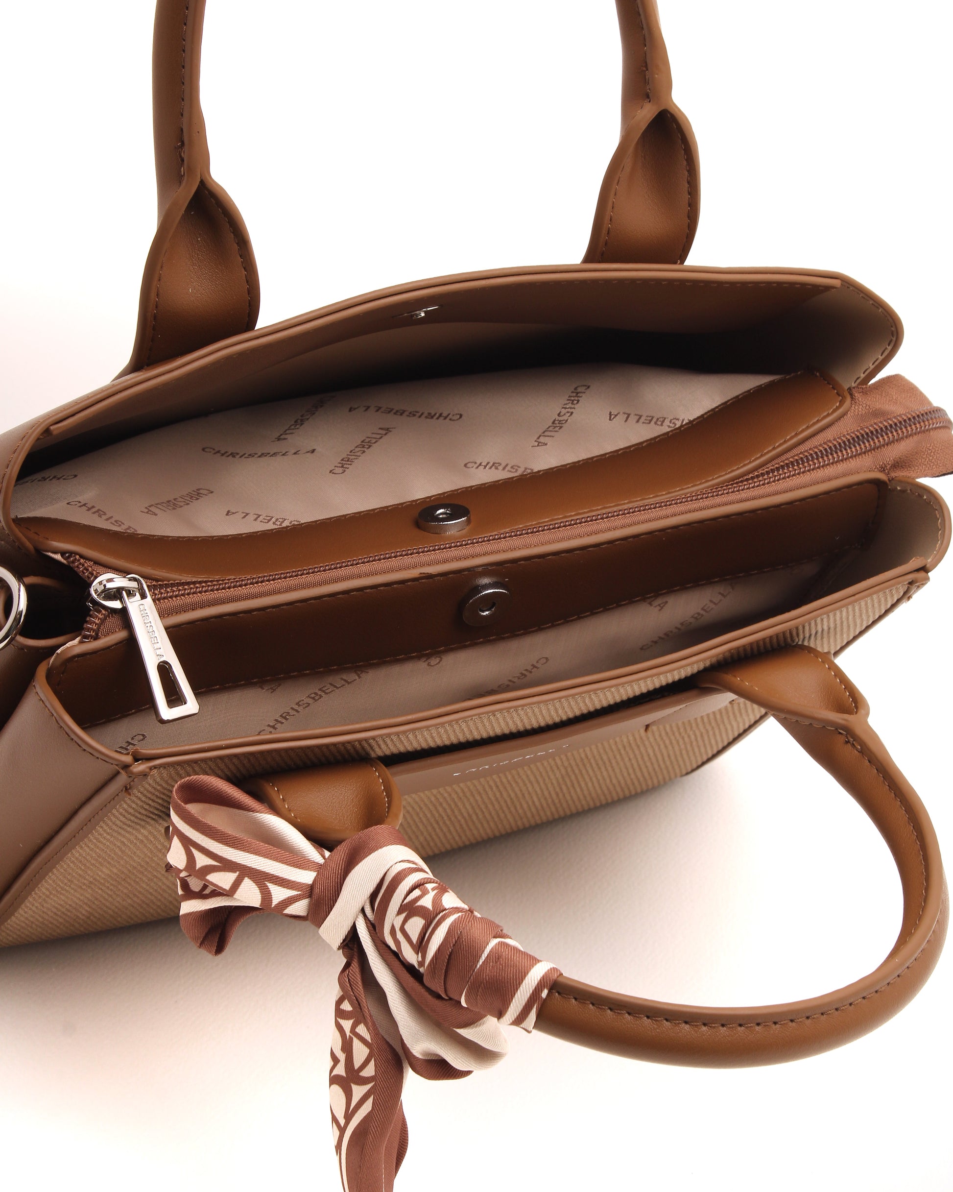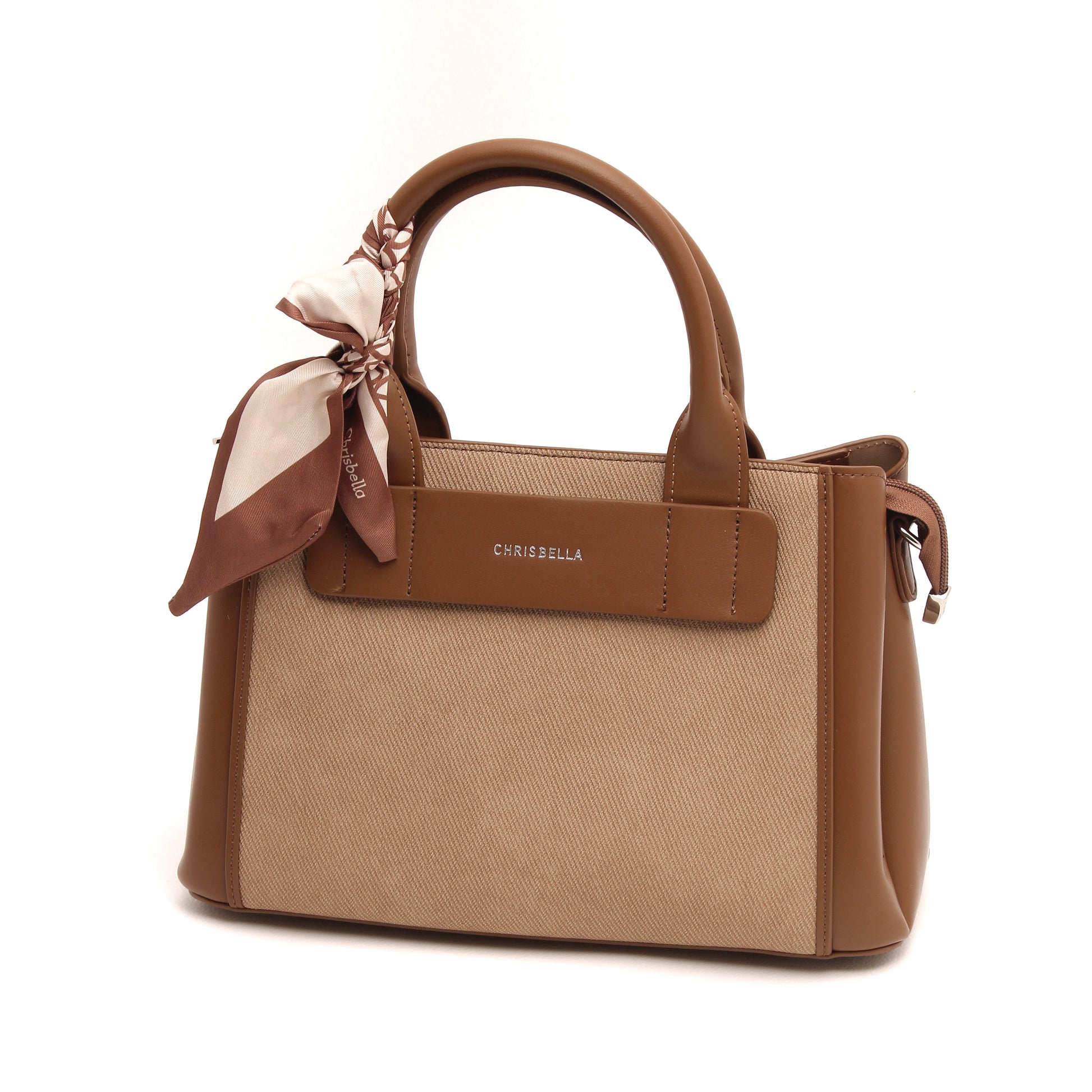 Thoughtful details such as the signature Chrisbella logo, elegant top handles, and a feminine scarf accent add a polished finish. Complete with a matching wallet and a detachable shoulder strap, this bag adapts effortlessly from day to evening.